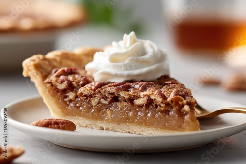 Delicious slice of pecan pie served on a plate with whipped cream and pecans for dessert