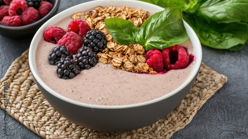Delicious smoothie bowl featuring granola, fresh raspberries, and blackberries, garnished with