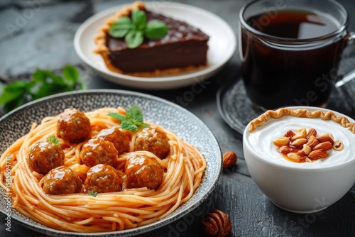 spaghetti, meatball, pasta, food, meal, dinner, lunch, delicious, dish, plate, brown, red, dark, dessert, chocolate, hot drink, tea, yogurt, nut, sweet, eatery, tasty, appetising, epicure, styling, background