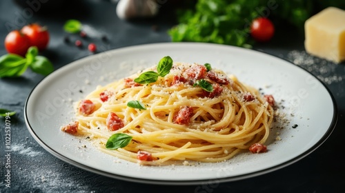 Delicious spaghetti carbonara garnished with fresh basil and parmesan cheese, served on an elegant plate for a perfect Italian meal.