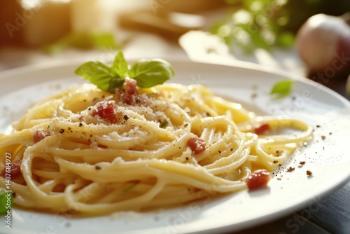 Delicious Spaghetti Carbonara with Parmesan Cheese and Basil