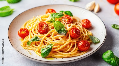 Delicious spaghetti topped with fresh tomatoes and basil, perfect for a savory meal or Italian cuisine inspiration.
