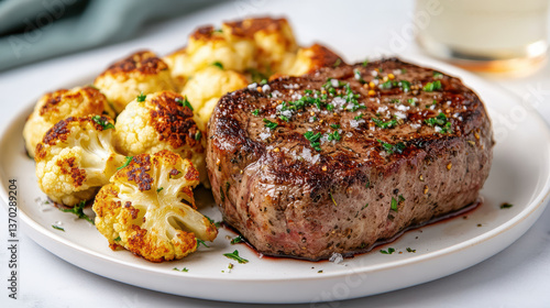 delicious steak served with roasted cauliflower, garnished with herbs, creating cozy dining