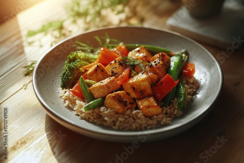 Delicious stir-fried salmon with vibrant vegetables on a bed of brown rice.