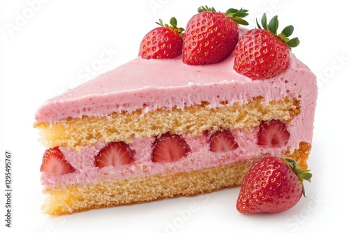 Delicious strawberry cake slice with creamy pink frosting and fresh strawberries on a white background perfect for dessert and sweet treat lovers