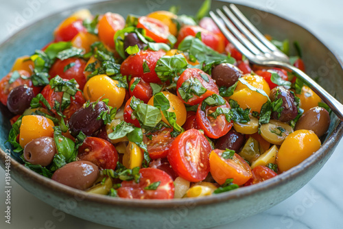 Delicious tomato and olive salad with fresh basil, served in a rustic bowl with a fork on a marble surface.