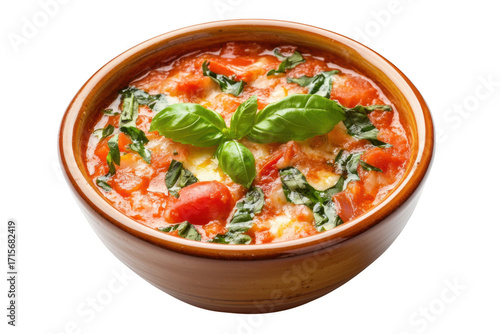 Delicious tomato soup bowl with fresh basil and spinach, healthy vegetable soup, culinary presentation, isolated on transparent background