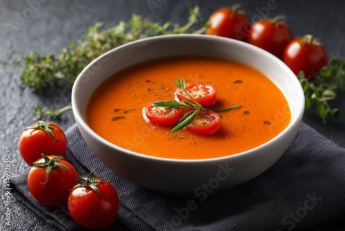 Delicious tomato soup in a bowl, garnished with fresh herbs.