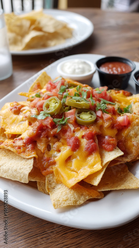 Delicious towering plate of nachos with cheese, jalapeños, and dips