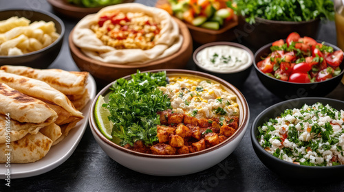 traditional, dish, food, table, vibrant, fresh, ingredient, cookery, herb, salad, rice, bread, spice, healthy, colourful, meal, presentation, dining, epicure, culinary, variety, mediterranean, favor, vegetarian, bowl, platter, feast, enjoyment, sharing