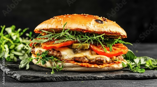 burger, food, drink, lettuce, tomatoes, pickle, sesame, patty, cheese, fresh, garnish, slate, surface, meal, tasty, savoury, herb, snack, culinary, epicure, cookery, kitchen, appetising, green, vegetable, photo, closeup, photo, lunch, breakfast, dinner, nourishment, fast food, healthy, grilled, eatery, bistro, preparation, dining, delicious, comfort, party, platter, organic, favor, indulgent