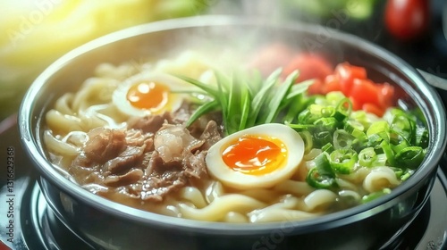 udon, noodle, bowl, topping, green, onion, egg, food, dish, meal, savoury, broth, steam, vegetable, ingredient, cookery, culinary, warmth, epicure, delicious, comfort, preparation, dining, asian, fresh, garnish, colours, healthy, eatery, presentation, appetising, stir, favor, noodle, chef, traditional, plate, soup
