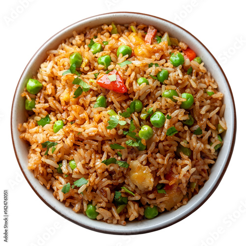 fried rice, asian cuisine, chinese food, indian food, rice, vegetable, pea, carrot, pepper, cilantro, bowl, cookery, food photography, delicious, tasty, savoury, healthy, meal, dinner, lunch, eatery, take-out, home cooking, receipe, cooking, ingredient, green, orange, brown, white, topview, closeup, isolated, background, black background, textured, aromatic, flavorful, vibrant, appetising, hunger, culinary, gastronomy