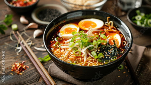 Delicious vegetarian ramen served on wooden table. Noodle soup.