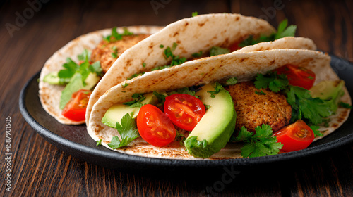 Delicious vegetarian tacos topped with fresh avocado, tomatoes, and herbs on a rustic plate. white 25357898 1