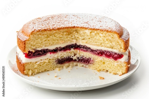 Delicious Victoria Sponge Cake with Cream and Jam Filling on a White Plate - Generative AI