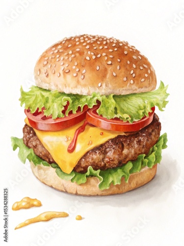 burger, cheeseburger, food, illustration, watercolor, painting, bun, sesame, lettuce, tomatoes, cheese, beef, patty, ketchup, delicious, tasty, meal, lunch, dinner, snack, fast, cookery, epicure, healthy, fresh, organic, eatery, cafes, dining, eat, appetence, ravenous, craving, juicy, appetising, seed, vegetable, bread, sandwich, art, artistic, artwork, drawing, colourful, vibrant, detail, studio, shot, isolated