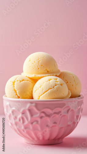 Delicious yellow sorbet scoops stacked in a pink decorative bowl, soft focus background, professional food photography concept of dessert, cafe, ice cream shop