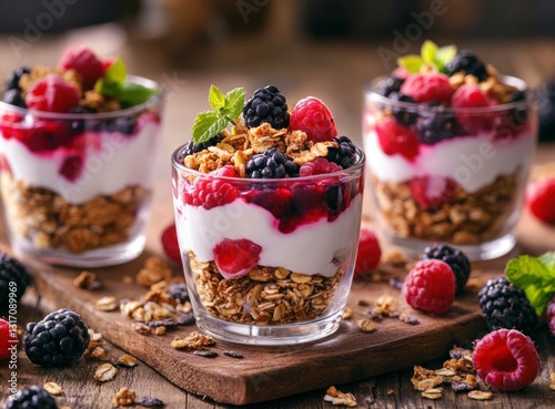 parfait, yogurt, granola, berry, eating, refreshing, serving, preparing, glasses, layer, mint, topping, wooden, table, raspberry, blackberry, fruit, sweet, tasty, breakfast, healthy, dessert, snack, nourishment, closeup, still life, organic, fresh, food, refreshment, homemade, diet, ingredient, delicious, cookery, nourishment, culinary, studio, presentation