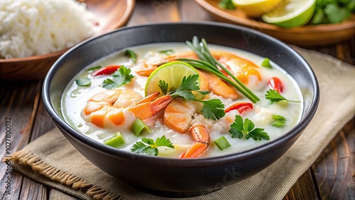 delicious,coconut milk soup, dinner, gourmet, Thai cuisine, A close up stock photo of a steaming coconut milk soup filled with succulent shrimp fluffy rice and vibrant vegetables