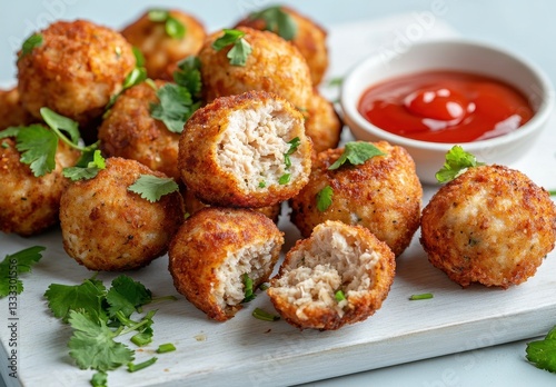 Deliciously Crispy Meatballs with Fresh Herbs Served with Tangy Ketchup on a Light Background for Culinary Creations and Food Photography