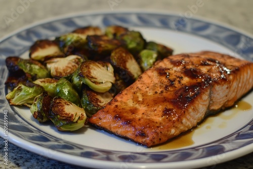 Deliciously Grilled Salmon Fillet Served with Roasted Brussels Sprouts on a Decorative Plate Ideal for Healthy Eating and Culinary Inspiration