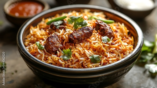 Deliciously plated biryani photo served in ceramic bowl, wide shot.. AI Generated