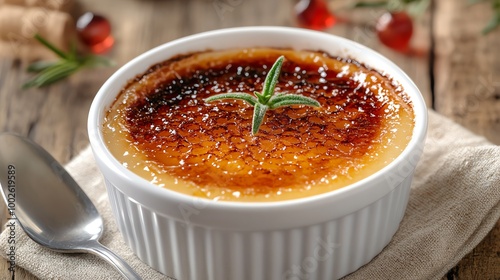 Deliciously rich creme brulee topped with caramelized sugar, served in a white ramekin, on a rustic wooden table.