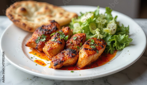 grilled chicken, salad, indian food, dinner, dish, food photography, gourmet food, closeup, plate, white plate, grilled, seasoned, delicious, flavorful, healthy eating, warm, appetising, spicey, cookery, dinnerware, professional, high-quality, eatery, chef, spicy sauce, healthy, dining, dietary, modern, contemporary