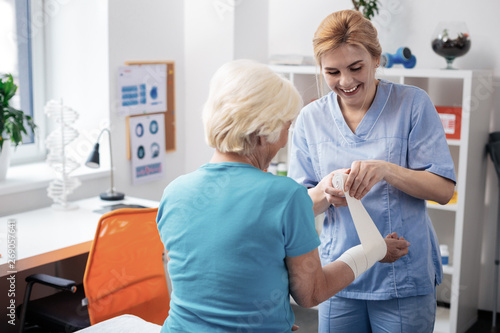 painful, baby boomer, age, social security, rehabilitation, bandage, hand, clinic, health care, medicine, healthy lifestyle, caucasian, closeup, two people, doctor, professional, nurse, service, room, indoor, light, short-haired, patient, 65, grey-haired, aging process, mature, adult, hospital, arm, maturity, generation, retirement, lifestyle, elderly, social, ageing