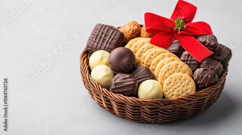 Delightful assortment of chocolates and cookies in woven basket, beautifully decorated with red bow, perfect for gifting or festive occasions