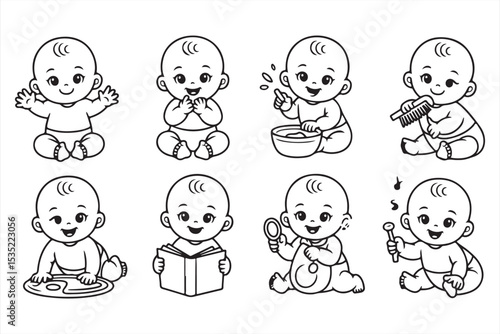 Delightful Baby Characters Engaged in Play and Learning Illustrated in Clean Line Art