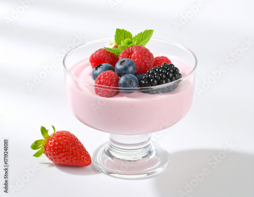 dessert, berry, cream, food, fresh, visual, lighting, presentation, simplicity, picture, honed, artistic, image, delightful, life, still, aesthetic, indulgence, refreshing, shot, treat, isolated, wholesome, elegant, vibrant, studio, arrangement, tabletop, white, element, space, modern, copy, minimalist, yogurt, strawberry, clean, topping, photo, healthy