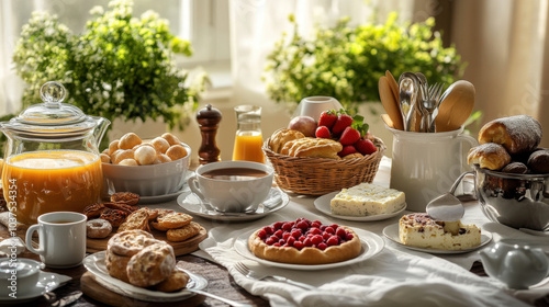 delightful breakfast spread featuring variety of pastries, fruits, and beverages. scene is bright and inviting, perfect for cheerful morning gathering
