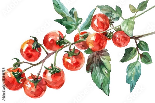 Delightful Cherry Tomatoes Watercolor Set on Branch, Organic Fresh Vegetable Illustration