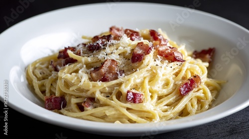 Delightful Creamy Pasta Carbonara Served in a White Bowl