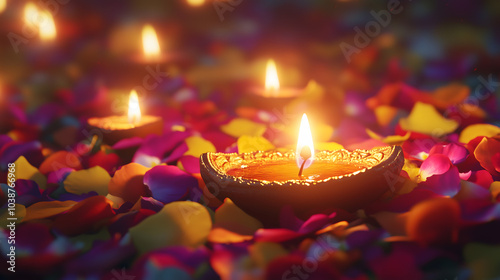 Delightful Diwali Greeting Background with Traditional Diya Lamp, Colorful Flowers, and Blurred Candlelight