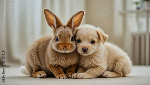 Delightful image of a young puppy and a rabbit seated closely, radiating warmth and friendship. Captures the adorable bond of animals