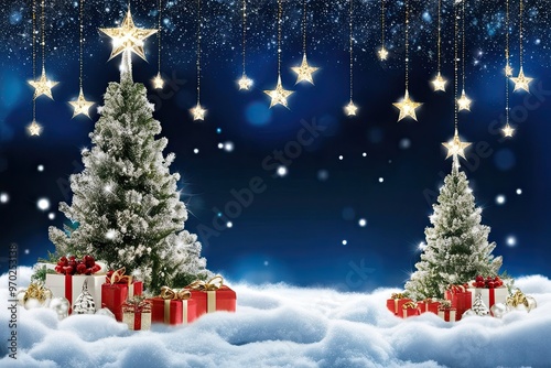 Delightful Winter Backdrop with Sparkling Christmas Tree, Fluffy Snow, and Glimmering Stars for a Cheerful Holiday Celebration