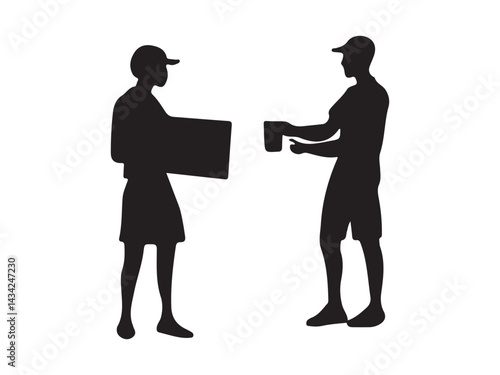 delivery, delivery person, package, parcel, exchange, transaction, handover, courier, logistic, shipping, silhouette, black-and-white, customer service, men at work, man, woman, business, e-business, transport, receiving, giving, modern, simple, illustration, graphic, mask, protection, safe, retail, uniform, cap, short, urban