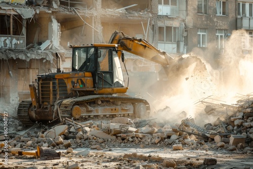 shoveling, demolition, construction, debris, dust, machinery, heavy, equipment, yellow, site, building, work, debris, concrete, metal, destruction, removal, clearing, powerful, industrial, urban, development, renovation, progress, transformation, renewal, activity, motion, chaos, effort, operator, engineer, ground, landscape, sky, day