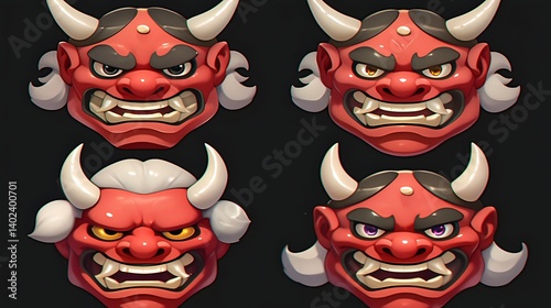 daemon, face, digital, art, design, illustration, cartoon, anime, character, graphic, red, horn, japan, mask, traditional, style, three-dimensional, model, rendering, drawing, artwork, concept, fantasy, japanese, culture, scarey, monster, evil, angry, expression, image