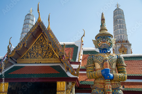 spiritual, god, sculpture, art, guardian, gold, holiday maker, exterior, ethnicity, siamese, tour tourism, exotic, southeast, bright, spirit, royal palace, statue, travel, temple, buddhist, culture, religion, grand, buddhism, wat, asian, asia, architecture, daemon, gold, religious, emerald, ancient, thai, bangkok, palace, decoration, siam, buddha, worship, royals, background, blue, traditional, closeup