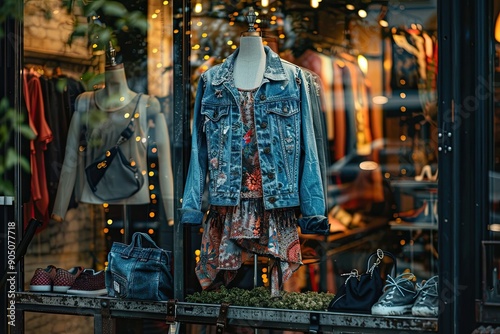 denim, jacket, window, display, store, shop, fashion, clothing, retail, mannequin, accessory, bag, purse, shoe, sneaker, light, glasses, metal, frame, vintage, casual attire, style, trend, design, retailer, boutique, urban, city, night, blur, bokeh, sharpened, detail, texture, pattern, colours, blue, brown, black, white, green, yellow, red, light, dark, shadow