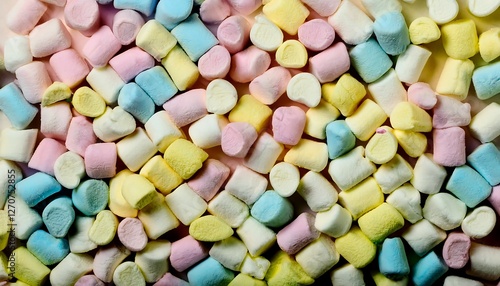 Dense arrangement of colorful jelly beans, emphasizing their smooth, shiny texture and vibrant hues. Ideal for Easter, candy, or playful food concepts. Texture, background.