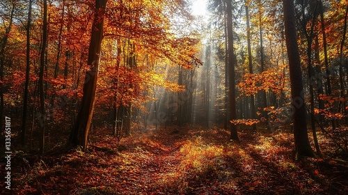 dense, autumn, forest, bright, orange, red, sunlight, tree, foliage, nature, landscape, peaceful, serene, wilderness, outdoors, scenic, tranquil, path, vibrant, natural, season, beauty, environment, colours, warm, ray, mist, wood, shadow, ground, hiking, explore, adventure, ecosystem, flora, scene, horizon, contrast, earth, sky, atmosphere, silence