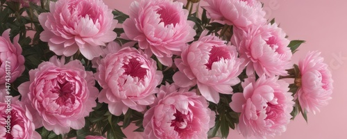 Dense cluster of pink peonies on a blush pink backdrop , spring, garden