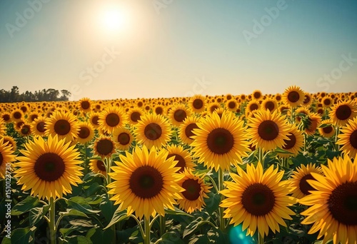 Dense field of vibrant sunflowers blooming under summer sun, farm, bright