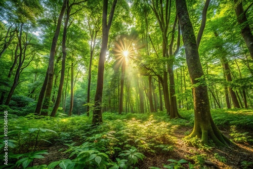 Dense foliage with sunlight filtering through the canopy creating dappled patterns on the forest floor, green, nature, forest
