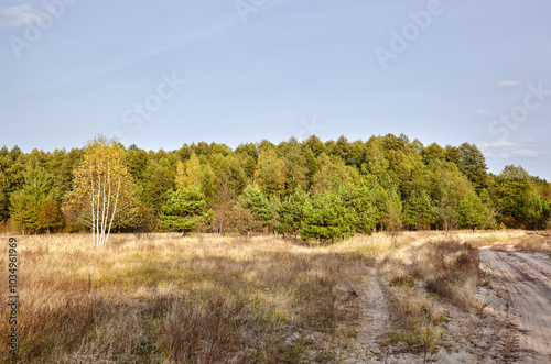 Dense forest against the sky and meadows. Beautiful landscape of a row of trees and road to forest